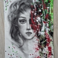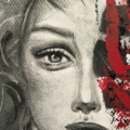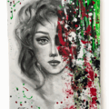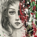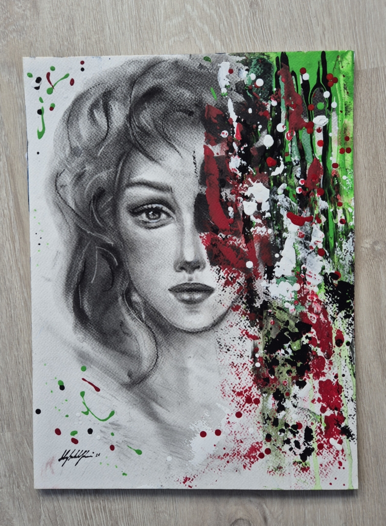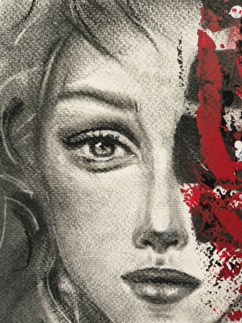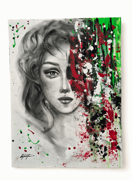 “Between Fire and Hope” is a powerful mixed media painting by THEMAYART, exploring the emotional tension between destruction and resilience. This expressive portrait artwork features a detailed female face drawn in soft charcoal (graphite), contrasted by bold, abstract acrylic paint splashes in red, black, green, and white.