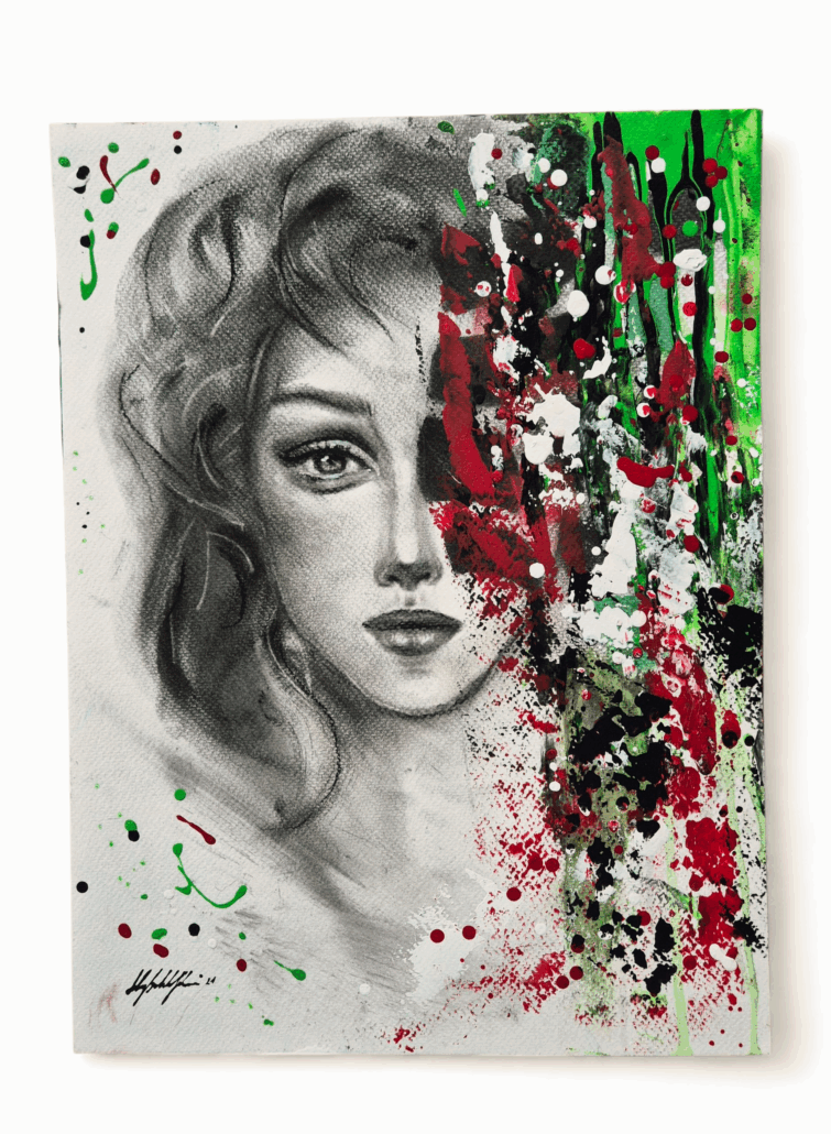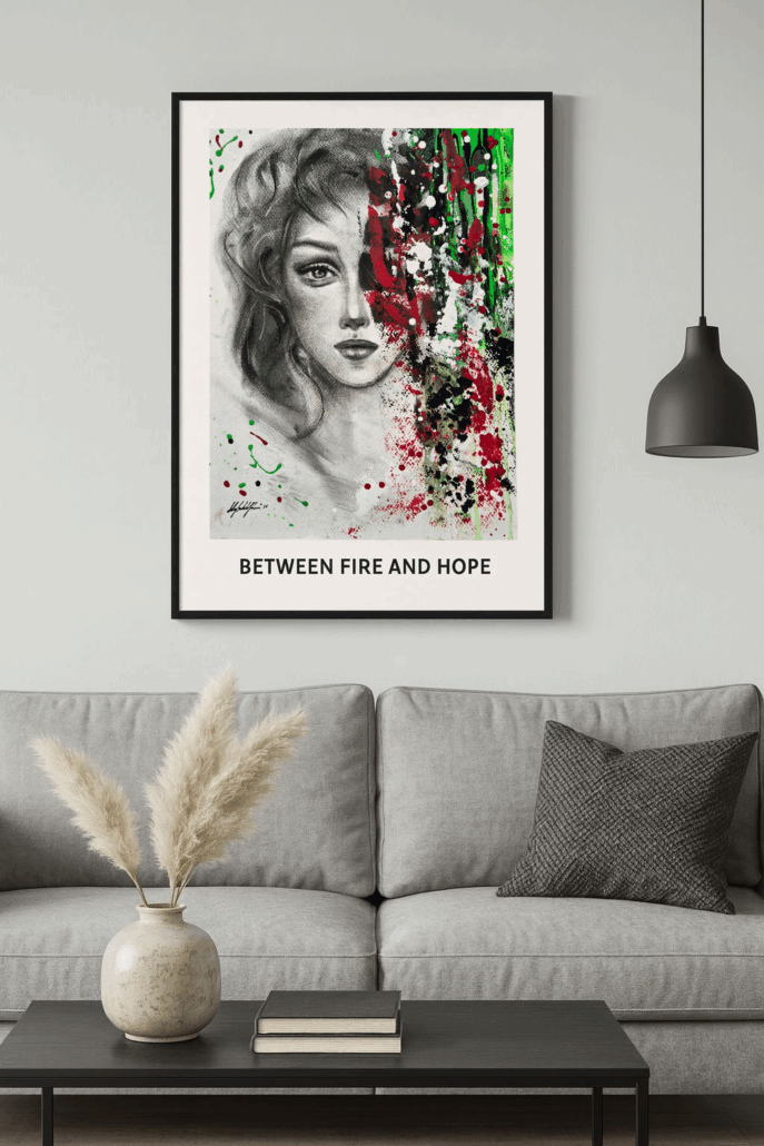 “Between Fire and Hope” is more than a visual statement — it’s a reflection on the global and personal struggle for peace, dignity, and inner strength. Through a fusion of figurative portraiture and expressive color work, the painting invites viewers to confront conflict not only as destruction, but as a space for transformation and rebirth.