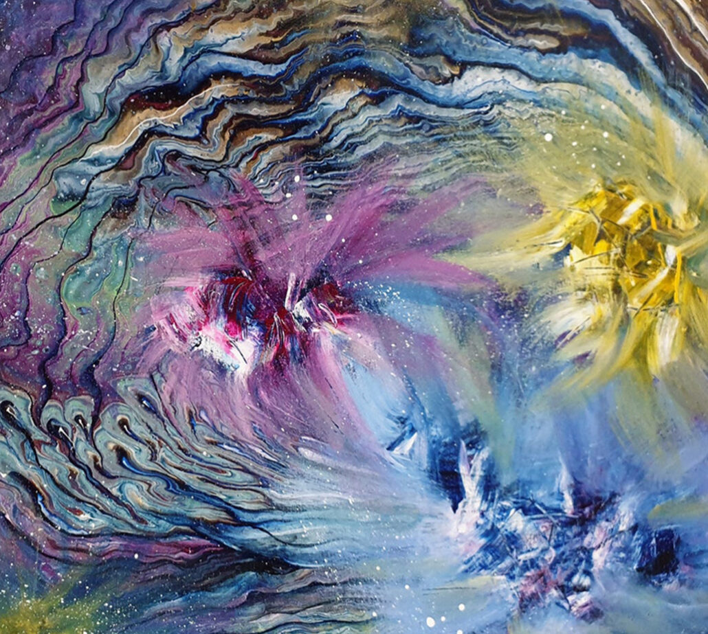 The artwork shimmers with dynamic swirls of purples, blues, golds, and radiant pinks, flowing like nebulae suspended in space. Layers of texture and movement evoke the birth of stars, the pull of cosmic energy, and the eternal rhythm of expansion. Each brushstroke feels alive, as if galaxies are unfolding in front of your eyes, carrying both chaos and harmony in their dance.